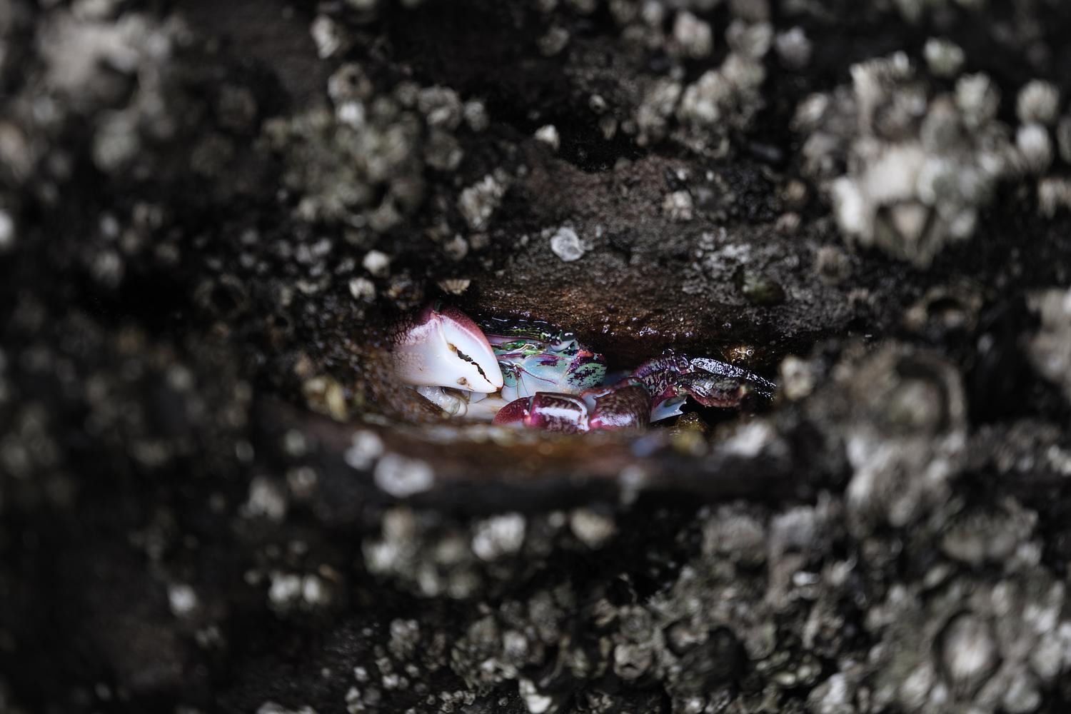Captured in 2024 at Quail Street Beach in Seal Rock, Oregon, Coastal Emergence reveals a vividly colored shore crab cautiously emerging from its rocky refuge, nestled among barnacle-covered surfaces. The dark, textured foreground frames the hidden world within, creating a sense of discovery and mystery. This intimate macro perspective highlights the resilience and beauty of coastal life, offering a glimpse into the small yet vibrant ecosystems that thrive along the tidepools.